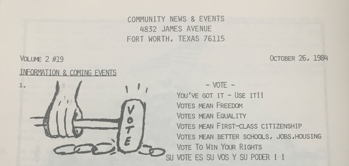 Throughout the 1980s, Gilbert Garcia, and Sam Garcia, another WWII veteran and active member of the G.I. Forum and PASSO utilized the Community News and Events newsletter (edited and distributed by Sam Garcia) to ensure their readership stayed informed and encouraged their engagement in politics of the city, state, and nation. The newsletter also kept their community aware of educational issues, activities of Latino organizations, and actions by city government and other major employers. The publication ran for more than a decade and had a circulation of more than 10,000 homes and businesses. The January 1984 edition listed the monthly meeting times of more than a dozen Hispanic organizations, including the Chicano Luncheon, Mexican American Democrats, La Hispana Business & Professional Women’s Club, LULAC Council 601, American G.I. Forum, I.M.A.G.E., demonstrating an active and informed group of Hispanic men and women in Fort Worth. The March 1984 issue announced an upcoming meeting to organize a “Council” made of “Hispanic leaders (both men and women) of different groups and organizations.” Sam Garcia also used the platform to voice which candidates he believed would better serve their community. In the October 1984 issue, the newsletter states: