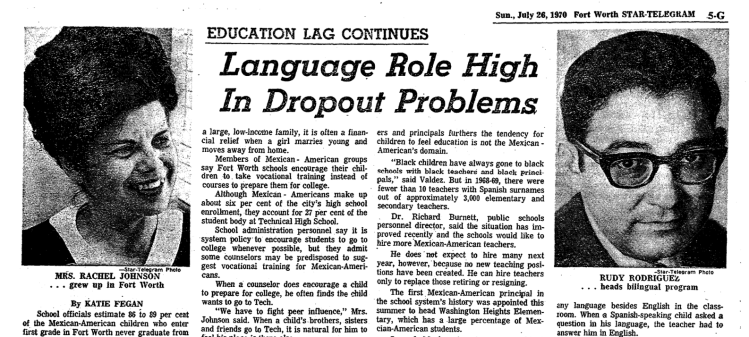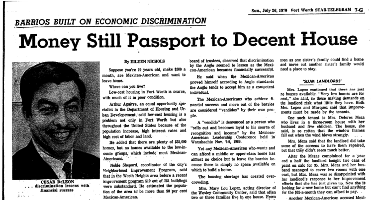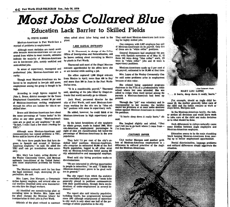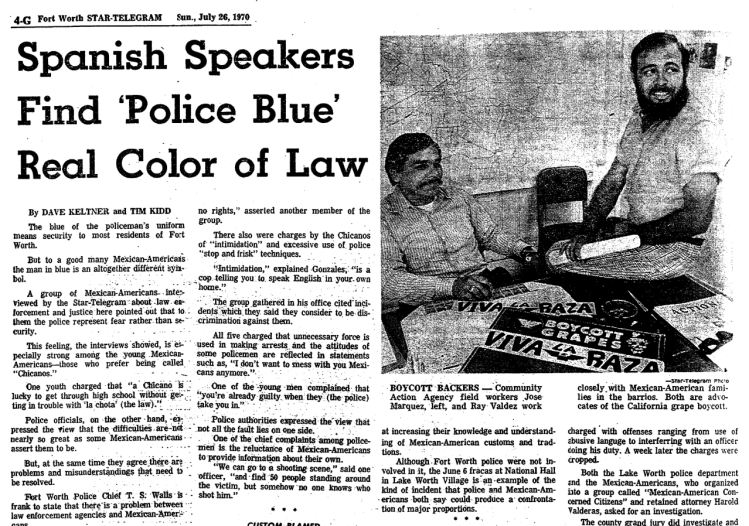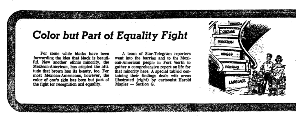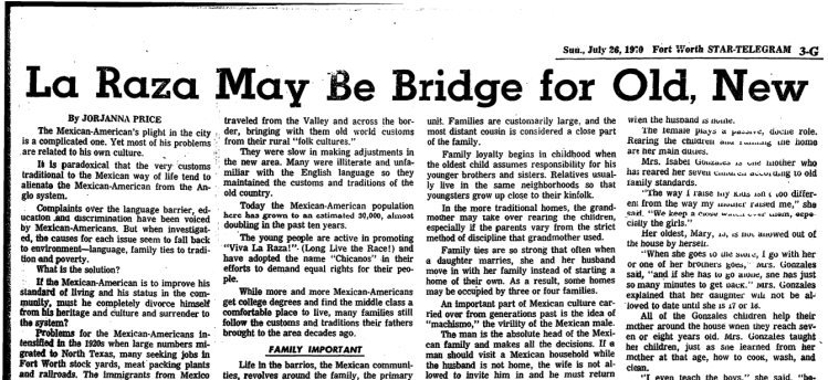 Six white interns, on summer vacation, in 1970, from various universities across Texas and the Midwest, investigated the conditions of the Mexican American community for a special edition of the Fort Worth Star Telegram. The Star-Telegram’s interest in the plight of Mexican Americans in Fort Worth is evident of both the gains made by the older WWII veteran activists led by Gilbert Garcia in the twenty five years since the end of the war and the national attention the younger Chicano activists brought to the continued inequalities in the lives of Mexicans in the United States. On the one hand, it is remarkable that the newspaper commissioned the piece—on the other hand, they gave the assignment to interns. The white interns initially attempted to knock on doors in barrios throughout Fort Worth on their own and found residents unwilling to speak freely. They expressed an inability to speak English or just told the interns there were no problems or discrimination issues. The young journalists then recruited several Mexican social workers and members of the Community Action Agency to accompany them. This time the residents were open to answering questions. The final analysis of the problems facing the Mexican American community in Fort Worth, according to these interns, was “related to their own culture”, and their “family ties to tradition and poverty.” The interns’ stereotypical view of Mexican families and their problems is also evident in their choice of illustration for the front cover, a Mexican man and woman with six young children. The Star Telegram also reported that a new and younger generation of Mexicans, who “have adopted the name Chicanos” were now making noise and demanding equal rights. Click on each image to read the full article.