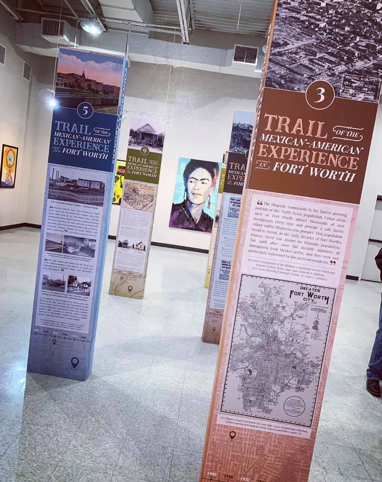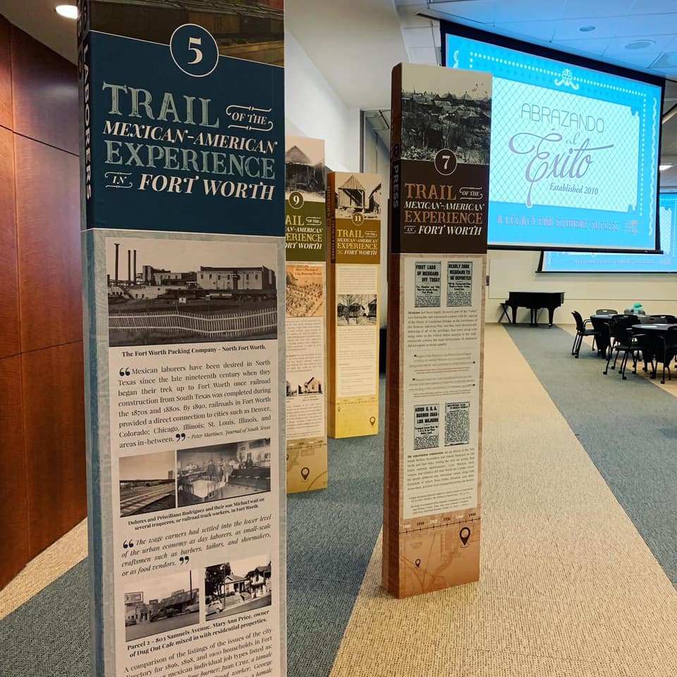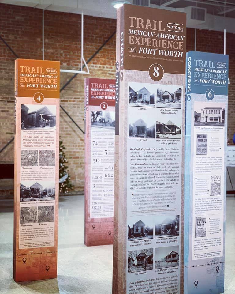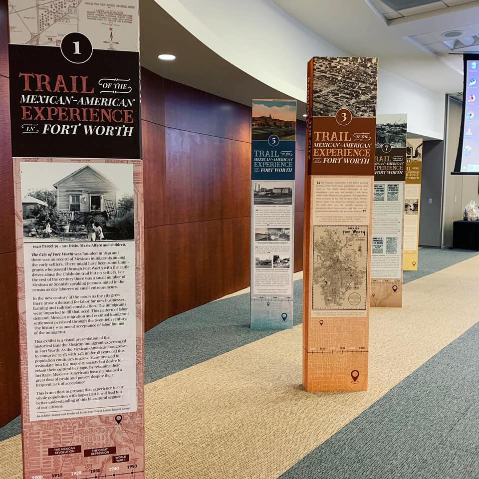 Created by Arturo Martinez using numerous visual resources from the Fort Worth Public Library and based on Dr. Peter Martinez’s research, this pop-up exhibit demonstrates the deep history of Mexican American’s in Fort Worth. The exhibit of 6 columns (12 panels) showcases the Mexican American experience from 1900 to 1950. Each pillar chronicles key moments that shaped the experiences of Mexican immigrants and highlights their journey from newly arrived laborers, through the building of their communities, and to permanent and active members of the city.
